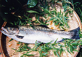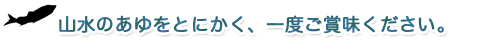 | あゆのお宿山水では綾川の澄んだ流れに育まれたピチピチのあゆを提供しています。背ごし・塩焼き・みそ焼きどれも天下一品の味です。当社の鮎は氷に入っておりますので、腹の中まで常温に戻すために、水の中に10分以上浸けてからお焼き下さい。家庭用のグリルでは、尾びれ、背びれが焦げますので、尾びれ、背びれに化粧塩をして、お好みに応じて全体に軽く塩を振ってお焼き下さい。火加減や鮎の大きさにもよりますが、両面で10分少々で焼けるかと思います。