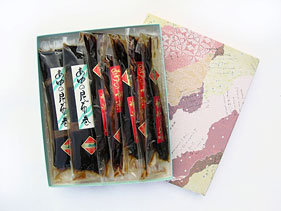 | 半乾燥あゆを北海道産昆布(利尻昆布)で丁重に巻き、醤油、酒等で煮込んであります。手づくりの味を心ゆくまでご賞味ください。